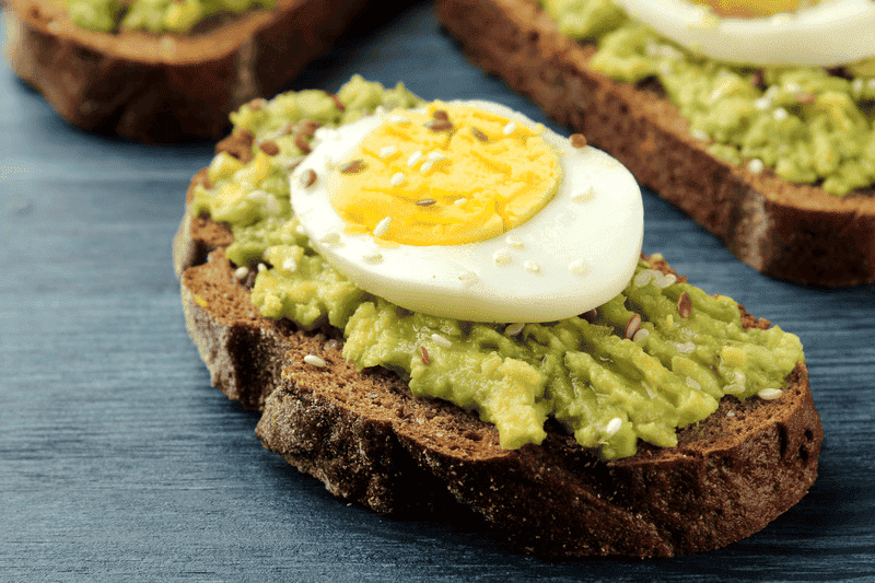Món ăn: Bánh mì nguyên cám, trứng luộc, bơ cắt lát