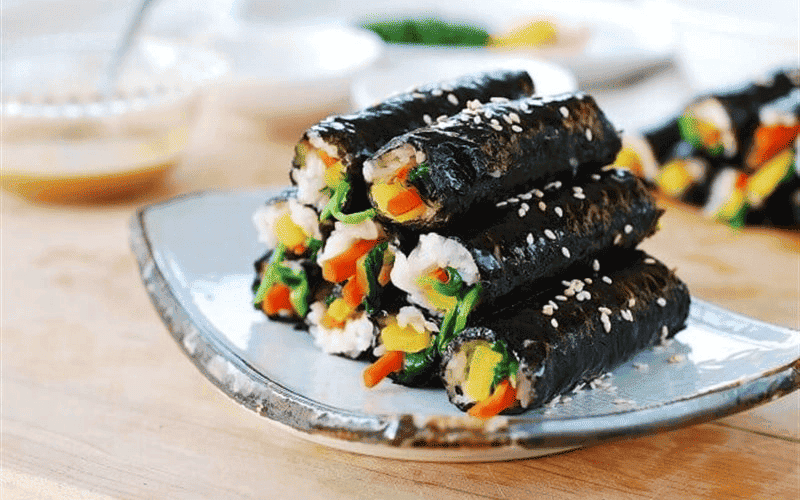 Cách làm: Trứng đánh tan, tráng mỏng rồi thái sợi. Cà rốt luộc mềm thái sợi. Trộn cơm với muối và dầu mè. Trải lá rong biển, dàn đều cơm lên, xếp trứng và cà rốt vào giữa. Cuộn chặt và thái thành các khoanh nhỏ vừa ăn.