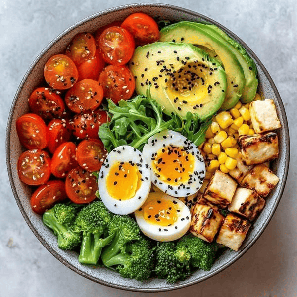Món ăn: Salad rau, trứng, ngũ cốc