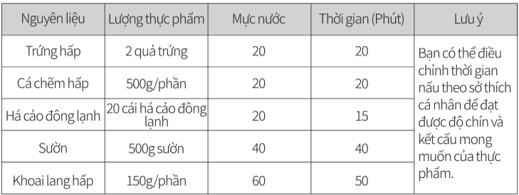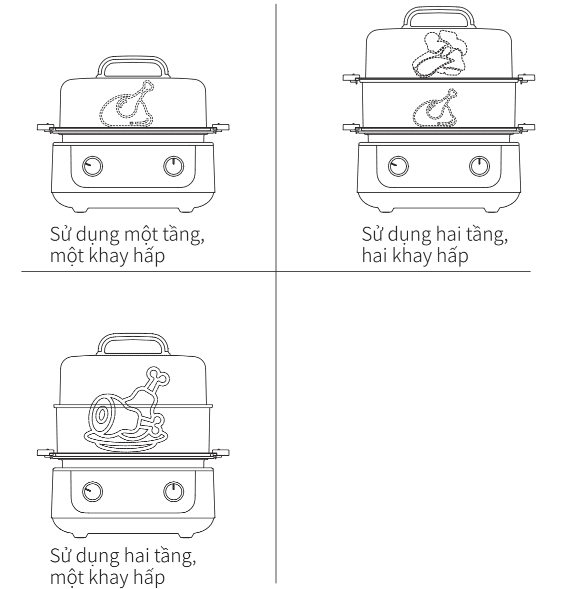 Lưu ý: Tùy thuộc vào loại sản phẩm và nhu cầu sử dụng cụ thể, vui lòng chọn số lượng khay hấp và tầng hấp phù hợp để sử dụng tối ưu.