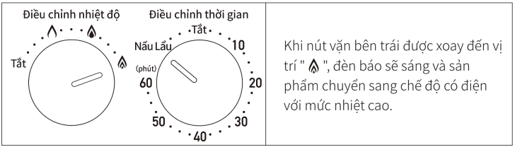 Đậy nắp lại và vặn nút bên phải đến chức năng "Nấu Lẩu". Điều chỉnh nút bên trái theo các bước dưới đây để bắt đầu nấu.