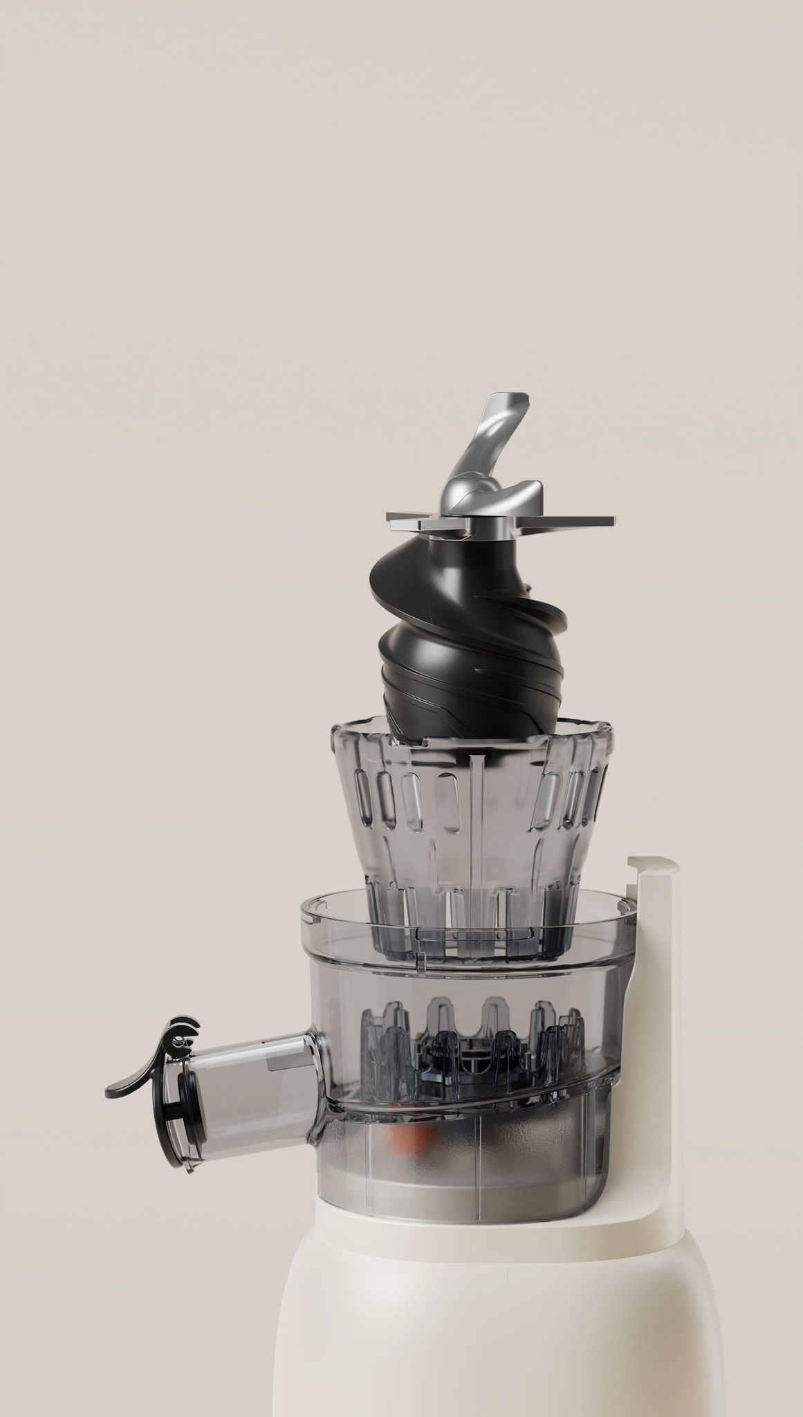 Bước 2: Tiếp theo, giữ chắc cụm khay chứa nước ép và đồng thời xoay ống tiếp nguyên liệu ngược chiều kim đồng hồ, sau đó kéo lên cùng lúc để tháo nó ra.