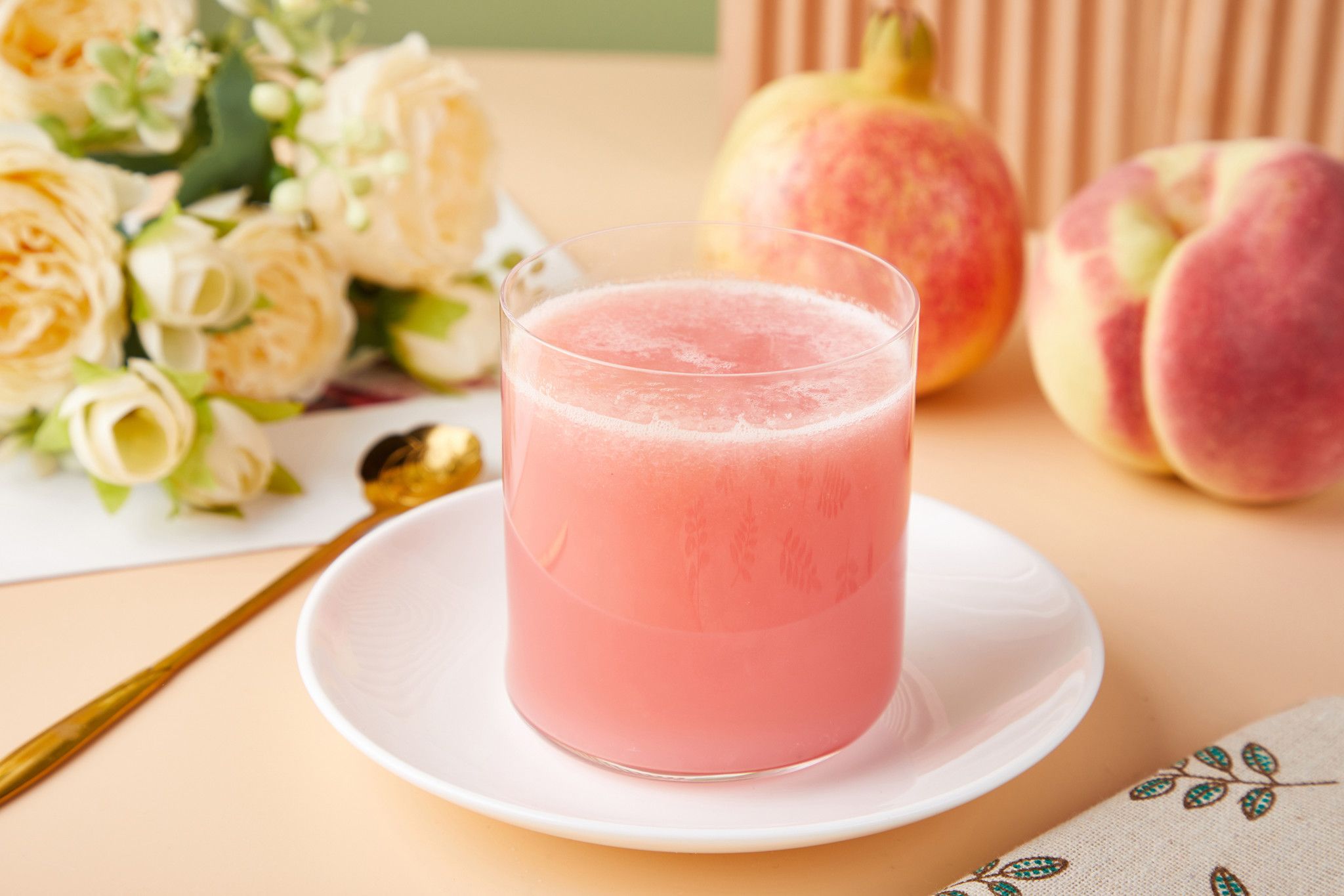 Tách múi bưởi, gọt vỏ đào, bỏ hạt, cắt thành miếng. Cho trà hoa nhài và nước lọc vào ly, ngâm trong 10 phút.