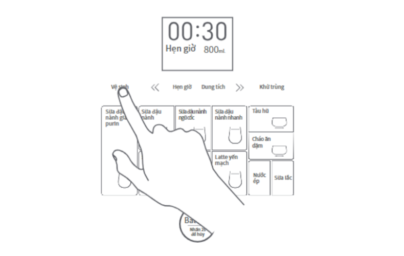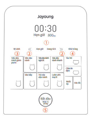 Chức năng giọng nói: Ở chế độ chờ, nhấn và giữ đồng thời phím "Trà sữa đậu nành" + phím "Hẹn giờ" trong 3 giây để tắt/bật chức năng giọng nói.