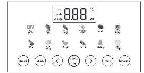 | Chưa khởi động thiết bị | Đẩy giỏ chiên vào, chọn chức năng phù hợp trong menu, nhấn nút Bắt đầu/Hủy | |
