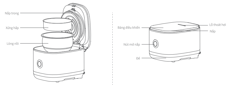 Cấu tạo chính của nồi bao gồm: đế, nút mở nắp, nắp nồi, bảng điều kiển, lỗ thoát hơi