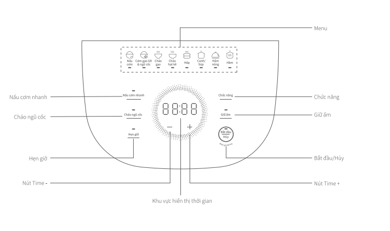 Nhấn nút "Chức năng", chọn chức năng nấu có thể hẹn giờ gồm: Cháo gạo, Cháo hạt kê, Hấp, Canh/Súp, Hầm, Cháo ngũ cốc