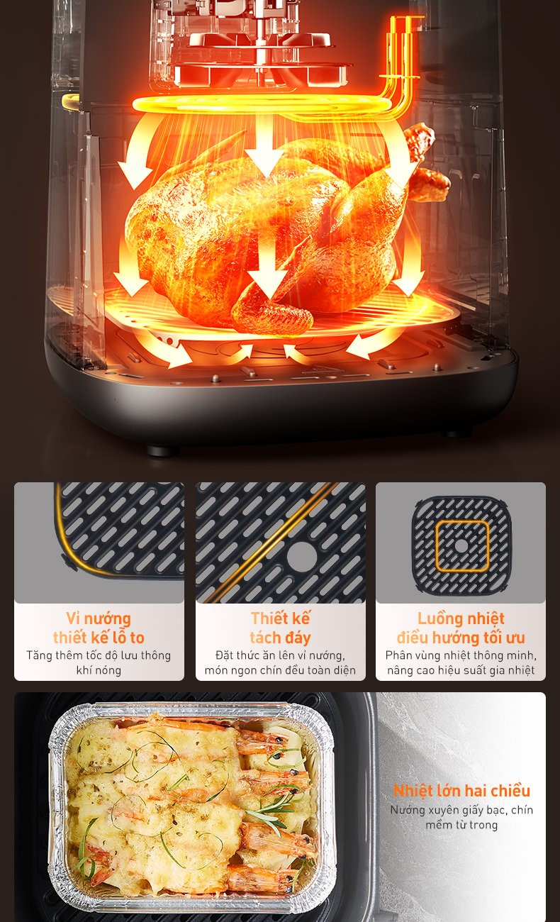 Thiết kế giỏ chiên và khay chiên: Nên ưu tiên các loại giỏ chiên có đáy xoáy hoặc đáy hình sao, giúp hướng luồng khí nóng di chuyển theo vòng xoáy 360° quanh thực phẩm. Khay chiên tách đáy có nhiều lỗ hoặc khe hở đều, kích thước lớn, cho phép khí nóng dễ dàng xuyên qua từ dưới lên, giúp bề mặt dưới của thực phẩm cũng vàng giòn như mặt trên.