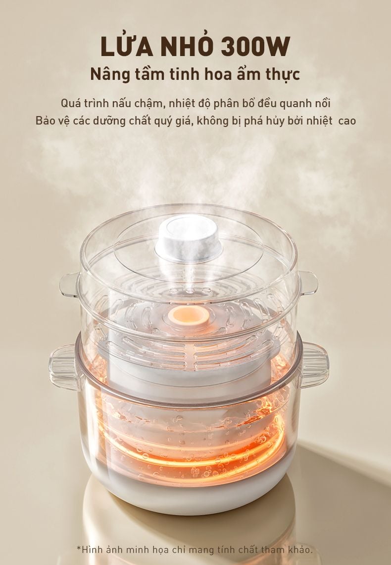 Thay vì chọn loại nồi chỉ có 1 thố lớn cố định, mẹ nên cân nhắc các dòng nồi nấu chậm có thiết kế đa thố – ví dụ: 1 thố lớn và 2 thố nhỏ đi kèm hoặc có khay hấp phía trên như nồi nấu chậm Joyoung JSC-187. Thiết kế này rất tiện lợi khi mẹ muốn nấu nhiều món cùng lúc, giúp tiết kiệm thời gian, công sức và điện năng tối đa.