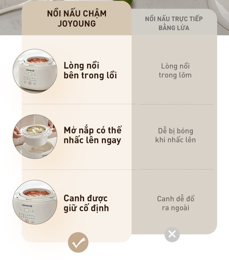 Ngoài ra, nồi nấu chậm Joyoung còn hỗ trợ tự ngắt an toàn khi cạn nước hoặc quá nhiệt, giúp mẹ an tâm hơn khi nấu mà không phải trông thường xuyên.