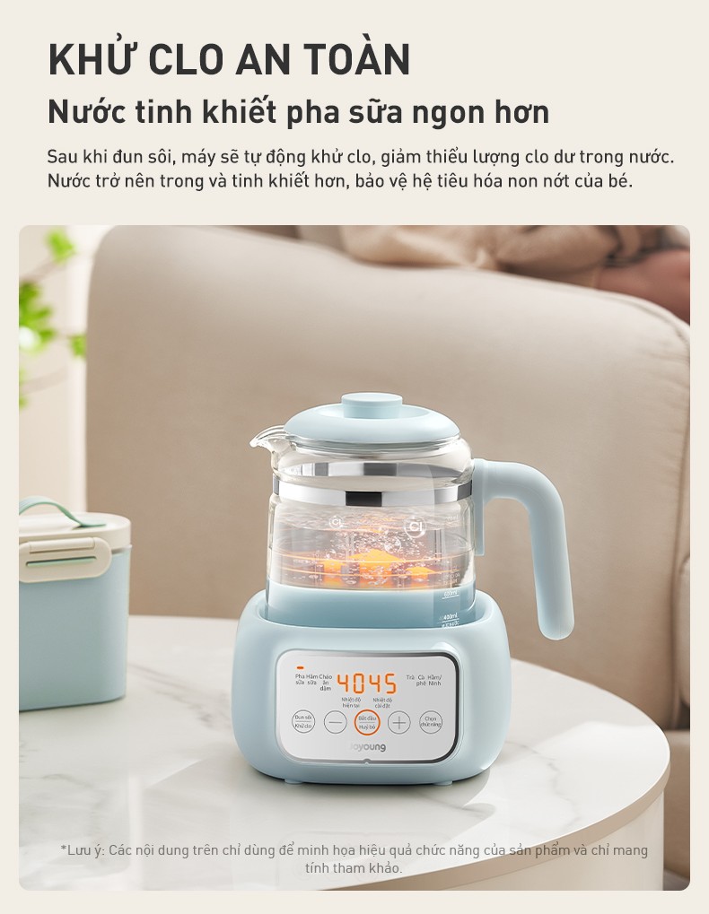Chức năng tự động khử Clo: Sau khi đun sôi, máy đun nước và hâm nước pha sữa sẽ tự động loại bỏ Clo dư thừa, mang lại nguồn nước tinh khiết, an toàn cho hệ tiêu hóa còn non nớt của trẻ.