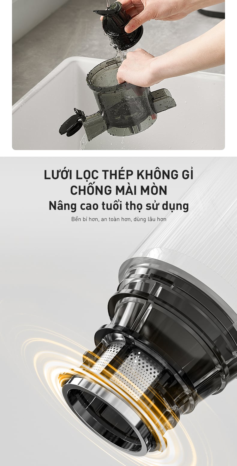 Bên cạnh đó, công suất 200W cùng lực ép mạnh mẽ lên đến 137Nm giúp máy vận hành ổn định ở tốc độ thấp, hạn chế sinh nhiệt và giữ trọn dưỡng chất. Công nghệ ép trục xoắn đa tầng không sử dụng lưỡi dao kim loại giúp giảm oxy hóa, cho nước ép giữ được màu sắc tươi tắn, hương vị nguyên bản và đạt tỷ lệ nước ép tinh khiết lên đến 98%, tối ưu vitamin và enzyme tự nhiên.