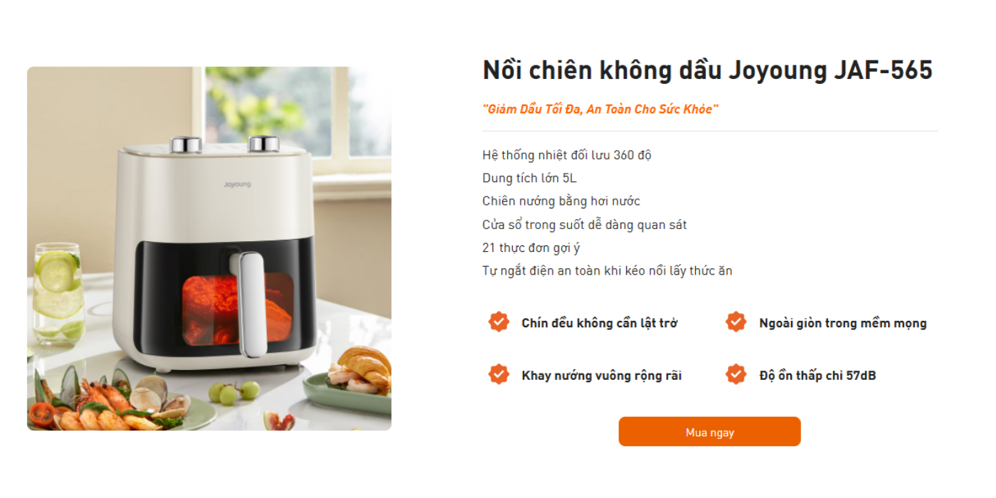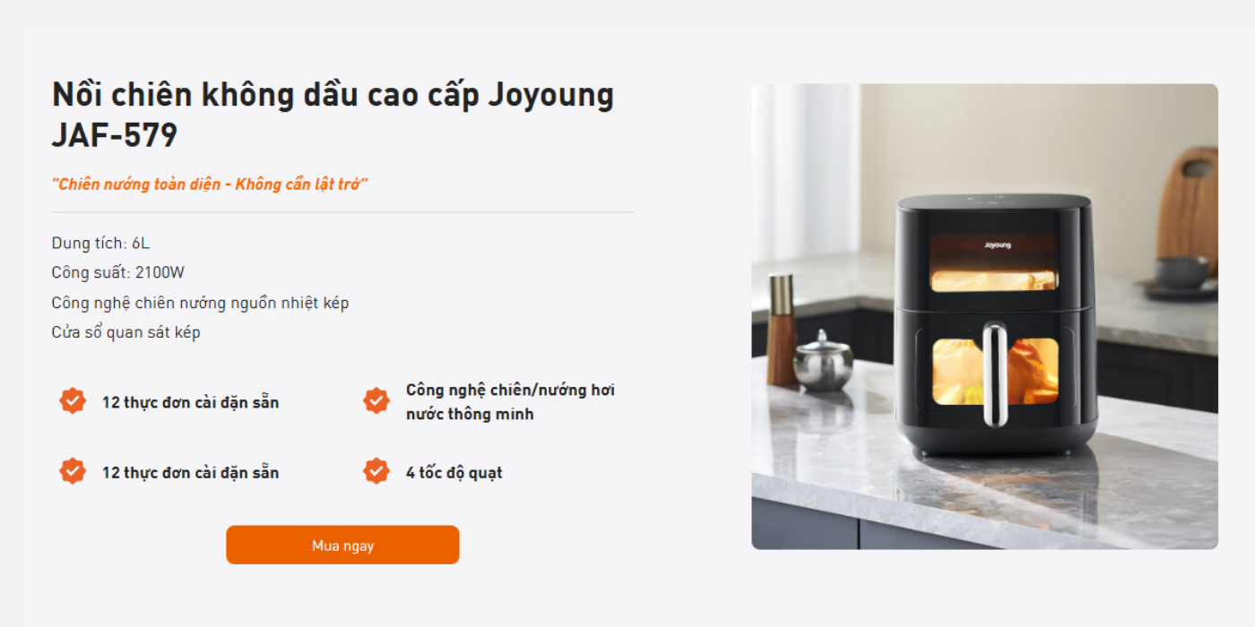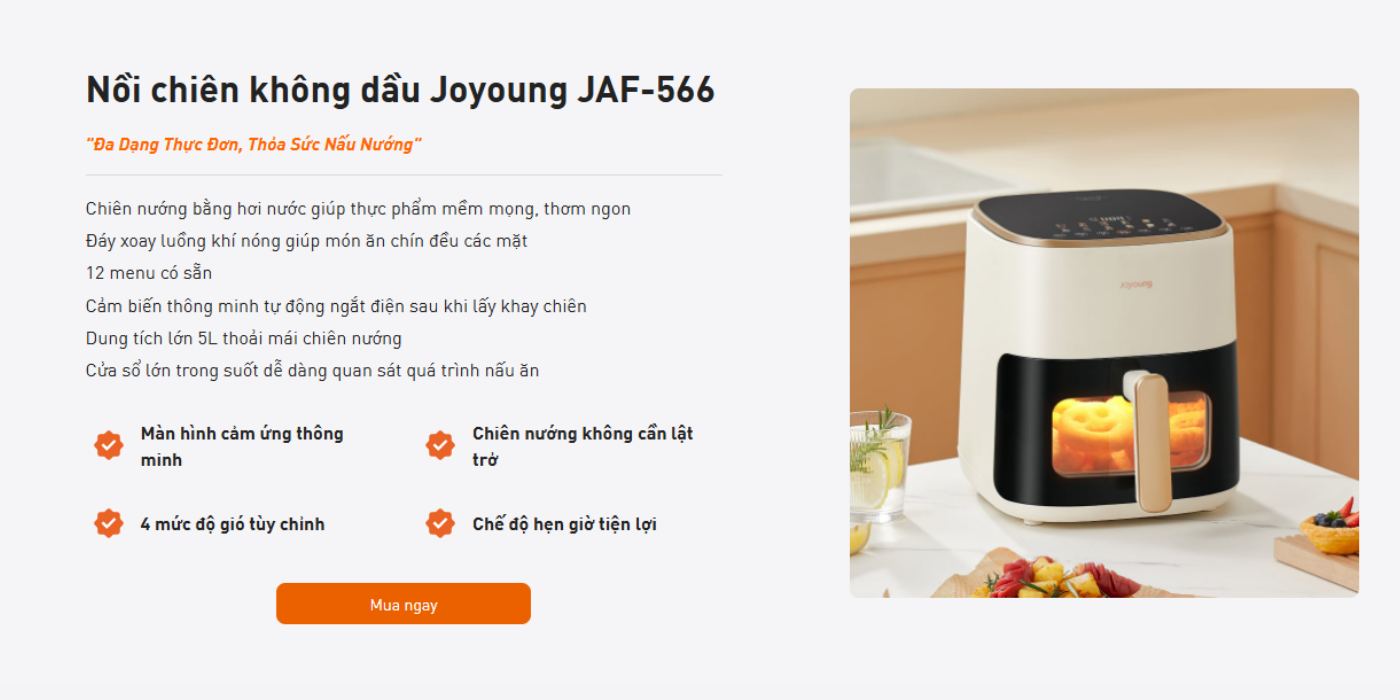 Tiêu chí | Nồi chiên không dầu cao cấp Joyoung JAF-579 | Nồi chiên không dầu Joyoung JAF-612 | Lò chiên nướng không dầu Joyoung KX30-V583 | Nồi chiên không dầu Joyoung JAF-565 | Nồi chiên không dầu Joyoung JAF-566 |