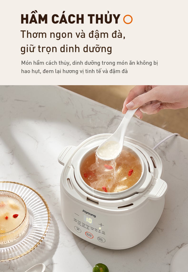 Trong giai đoạn ăn dặm, hệ tiêu hóa của bé còn non nớt nên các món ăn cần được chế biến kỹ, mềm mịn và dễ hấp thu. Phương pháp nấu chậm giúp thực phẩm chín từ từ ở nhiệt độ ổn định, giữ nguyên dưỡng chất và giúp cháo trở nên sánh mịn hơn, rất phù hợp cho bé mới bắt đầu tập ăn. Ngoài ra, các mẫu nồi nấu chậm thông minh hiện nay như nồi nấu chậm Joyoung còn có tính năng chuyển sang giữ ấm sau khi nấu xong nên mẹ có thể tranh thủ thời gian nghỉ ngơi hoặc làm việc khác mà không lo cháo bị khê hay cạn nước.