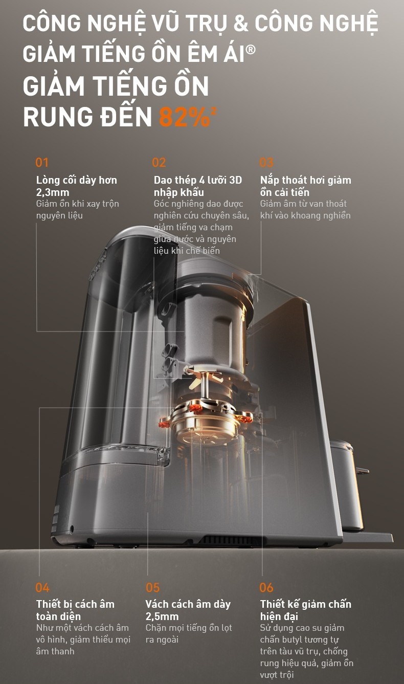 JSCB-K7 PRO sử dụng động cơ biến tần không chổi than (đã được chứng nhận chất lượng bởi Viện Nghiên cứu Thiết bị Gia dụng Trung Quốc) giúp giảm đến 82% tiếng ồn rung trong quá trình hoạt động. Điều này đảm bảo rằng dù bạn sử dụng máy vào sáng sớm hay ban đêm, Joyoung JSCB-K7 PRO vẫn hoạt động siêu êm ái, không gây ảnh hưởng đến sinh hoạt của gia đình. Bạn có thể dễ dàng sử dụng máy mà không lo lắng về tiếng ồn làm phiền, tạo ra một không gian yên tĩnh và thoải mái cho các thành viên trong gia đình.