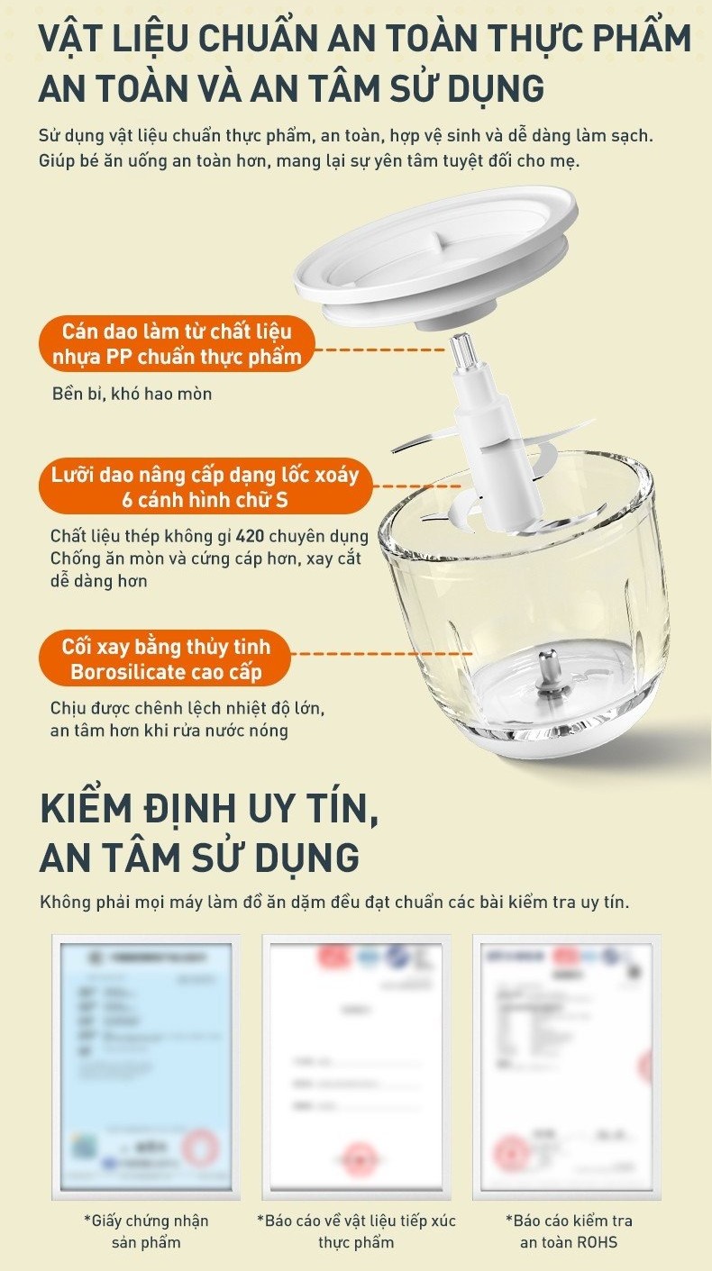 Cán dao nhựa PP an toàn thực phẩm: Được làm từ nhựa PP đạt tiêu chuẩn, không chứa BPA, bền nhẹ, chịu nhiệt tốt và chống gỉ sét. Cán dao giúp cố định chắc chắn lưỡi dao trong quá trình xay, đảm bảo máy xay cho trẻ ăn dặm vận hành êm ái và ổn định.