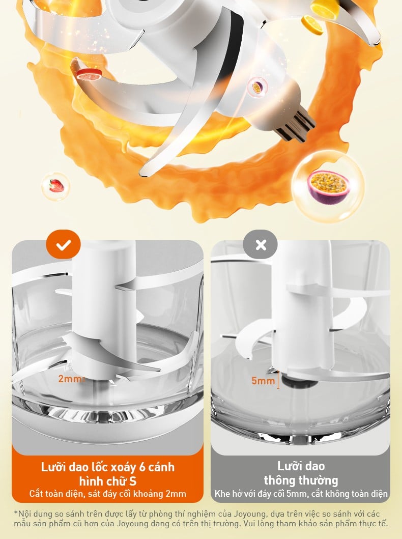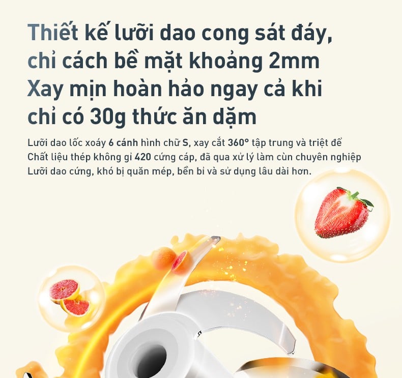 Máy xay ăn dặm Joyoung JBFC-166 được trang bị lưỡi dao lốc xoáy 6 cánh cong, thiết kế đặc biệt nằm sát đáy cối chỉ cách 2mm, xay cắt 360° toàn diện. Nhờ đó, dù chỉ với lượng thực phẩm ít từ 30g, máy vẫn có thể xay nhuyễn mịn hoàn toàn, không bỏ sót nguyên liệu nằm sát đáy cối.