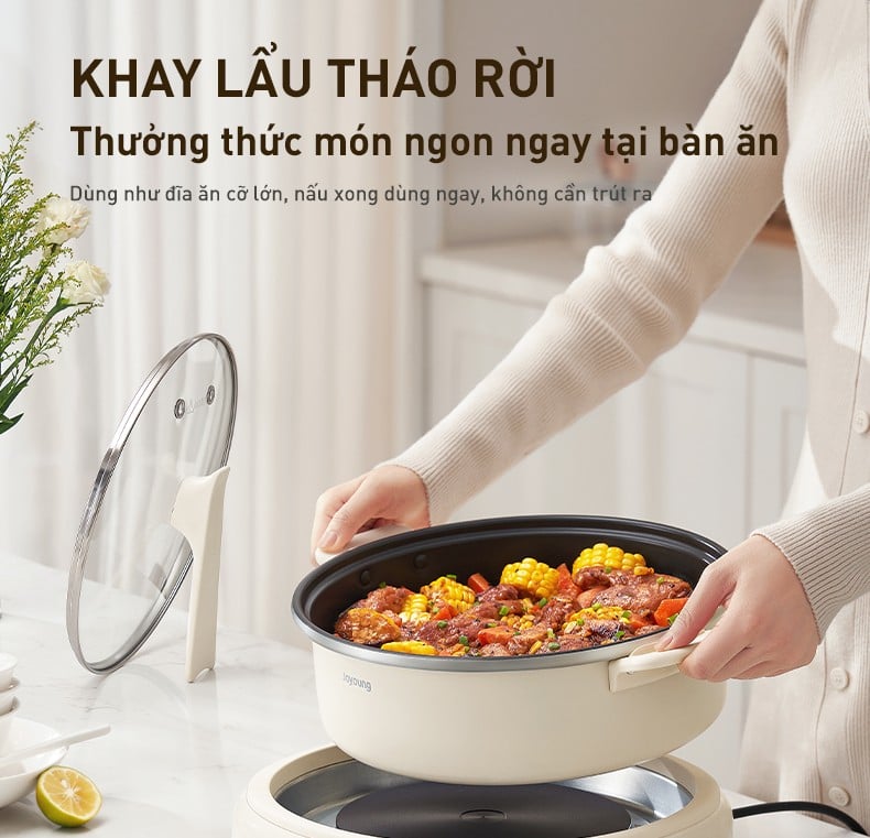 Nồi lẩu đa năng Joyoung JHP-525 sở hữu dung tích lớn 5L với lòng nồi sâu 90mm, mang đến sự rộng rãi, thoải mái cho những buổi tiệc lẩu quây quần cùng gia đình và bạn bè. Thiết kế khay lẩu tháo rời tiện lợi cho phép bạn dễ dàng nhấc khay ra đặt trực tiếp lên bàn ăn như một vật đựng lớn gọn gàng và đẹp mắt. Lòng nồi lẩu điện đa năng được làm từ hợp kim dày dặn phủ lớp chống dính kháng khuẩn cao cấp, hạn chế bám dính thực phẩm, an toàn cho sức khỏe và giúp việc vệ sinh trở nên nhanh chóng, nhẹ nhàng hơn.