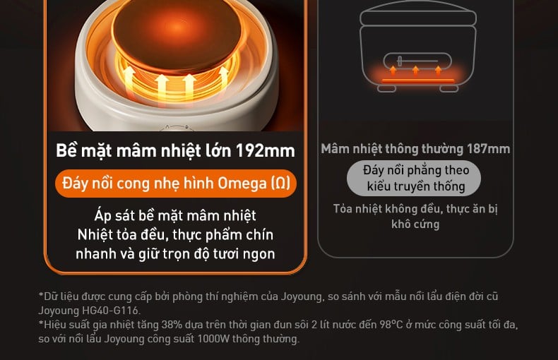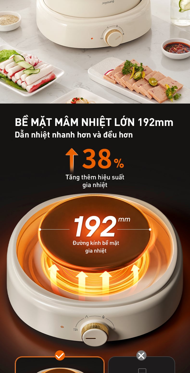 Nồi lẩu đa năng Joyoung JHP-525 được trang bị công suất mạnh mẽ lên đến 1600W, mang đến khả năng gia nhiệt nhanh và ổn định, giúp nước lẩu nhanh sôi. Sự kết hợp giữa mâm nhiệt lớn đường kính 192mm và thiết kế đáy nồi cong nhẹ hình Omega (Ω) cho phép lòng nồi áp sát hoàn hảo vào bề mặt mâm nhiệt, tối ưu hiệu suất truyền nhiệt và giúp nhiệt lượng lan tỏa đều khắp đáy nồi lẩu nướng. Nhờ đó, thực phẩm được làm chín nhanh, giữ trọn hương vị tươi ngon, tận hưởng trọn vẹn những phút giây sum họp bên bàn lẩu mà không phải chờ đợi lâu.