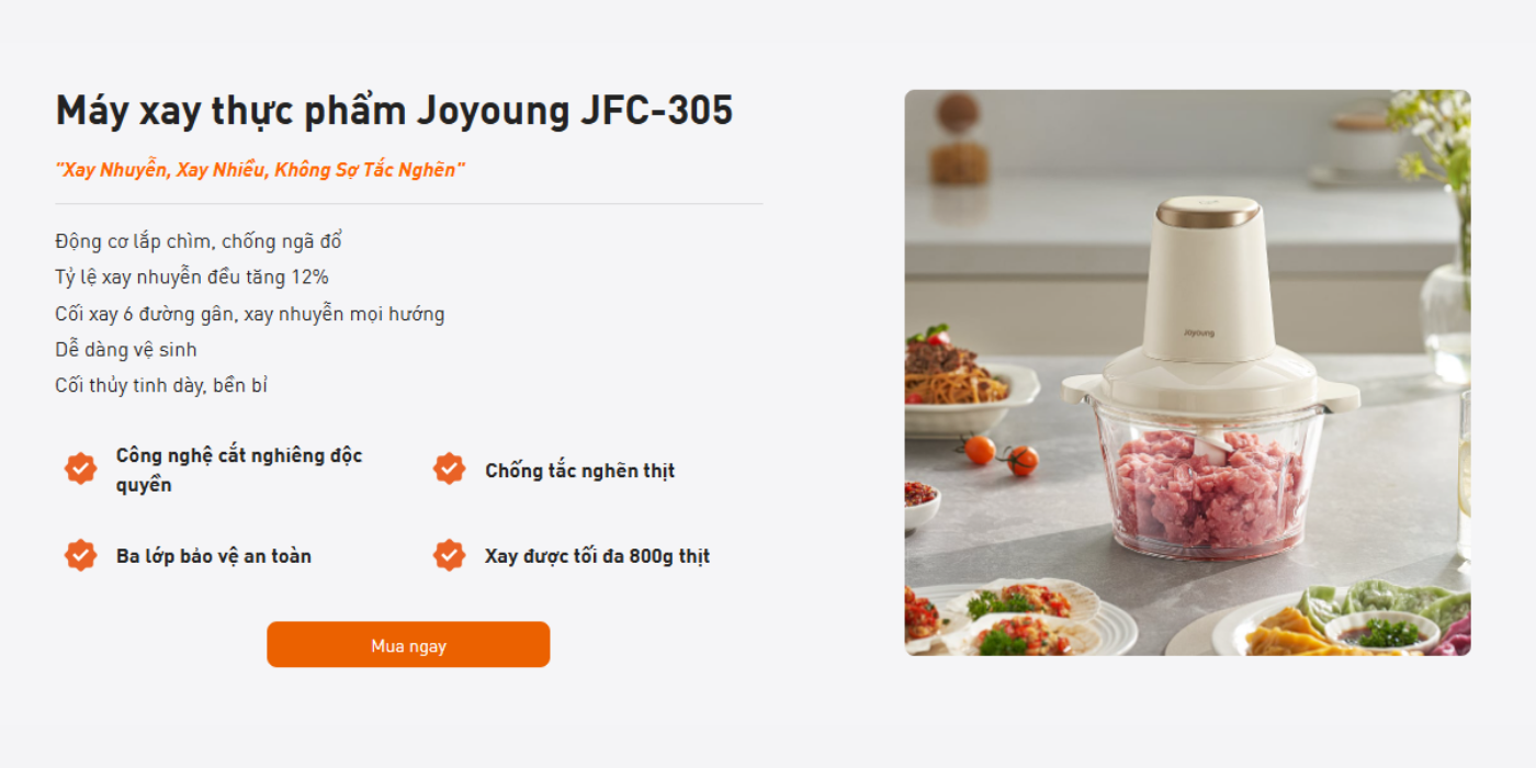 Máy xay thực phẩm là trợ thủ đắc lực giúp bạn tiết kiệm thời gian chuẩn bị nguyên liệu, từ xay thịt, cá cho đến rau củ. Trong vô vàn lựa chọn, hai sản phẩm máy xay thực phẩm Joyoung JFC-808 và JFC-305 nổi bật với công nghệ hiện đại và hiệu suất vượt trội. Vậy đâu là lựa chọn phù hợp nhất cho căn bếp của bạn? Hãy cùng Joyoung Vietnam so sánh máy xay thực phẩm JFC-305 và máy xay thực phẩm JFC-808 chi tiết qua bài viết sau để giúp bạn đưa ra quyết định phù hợp nhất!