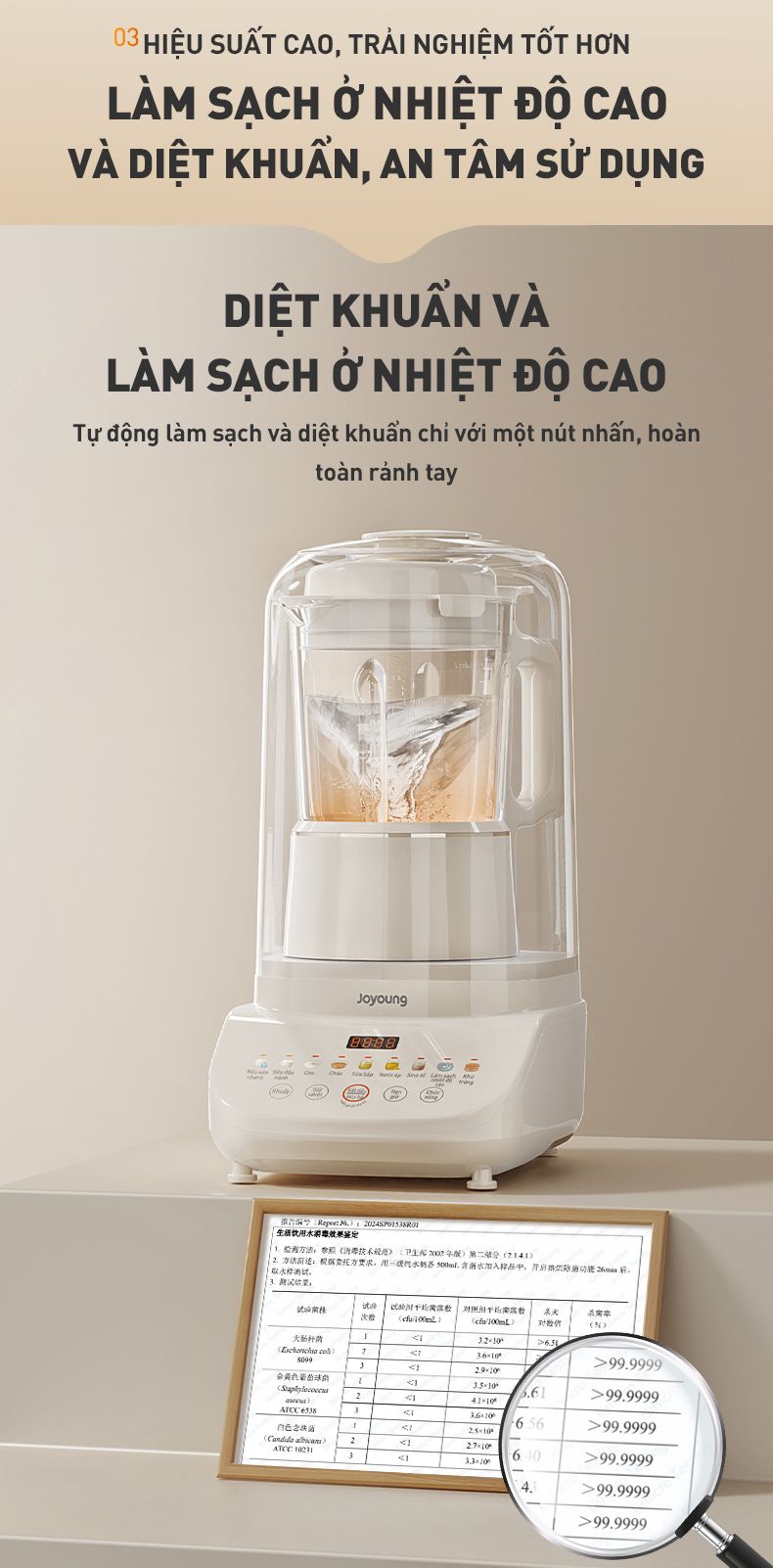 Máy có chức năng làm sạch bằng nhiệt độ cao. Sau mỗi lần nấu, bạn chỉ cần bấm nút là máy sẽ rửa sạch lưỡi dao và cối mà không cần tháo ra. Trong quá trình làm sạch, máy còn có khả năng khử trùng bằng nước nóng, đảm bảo loại bỏ đến 99.9999% vi khuẩn. Không cần dùng xà phòng hay rửa thủ công.