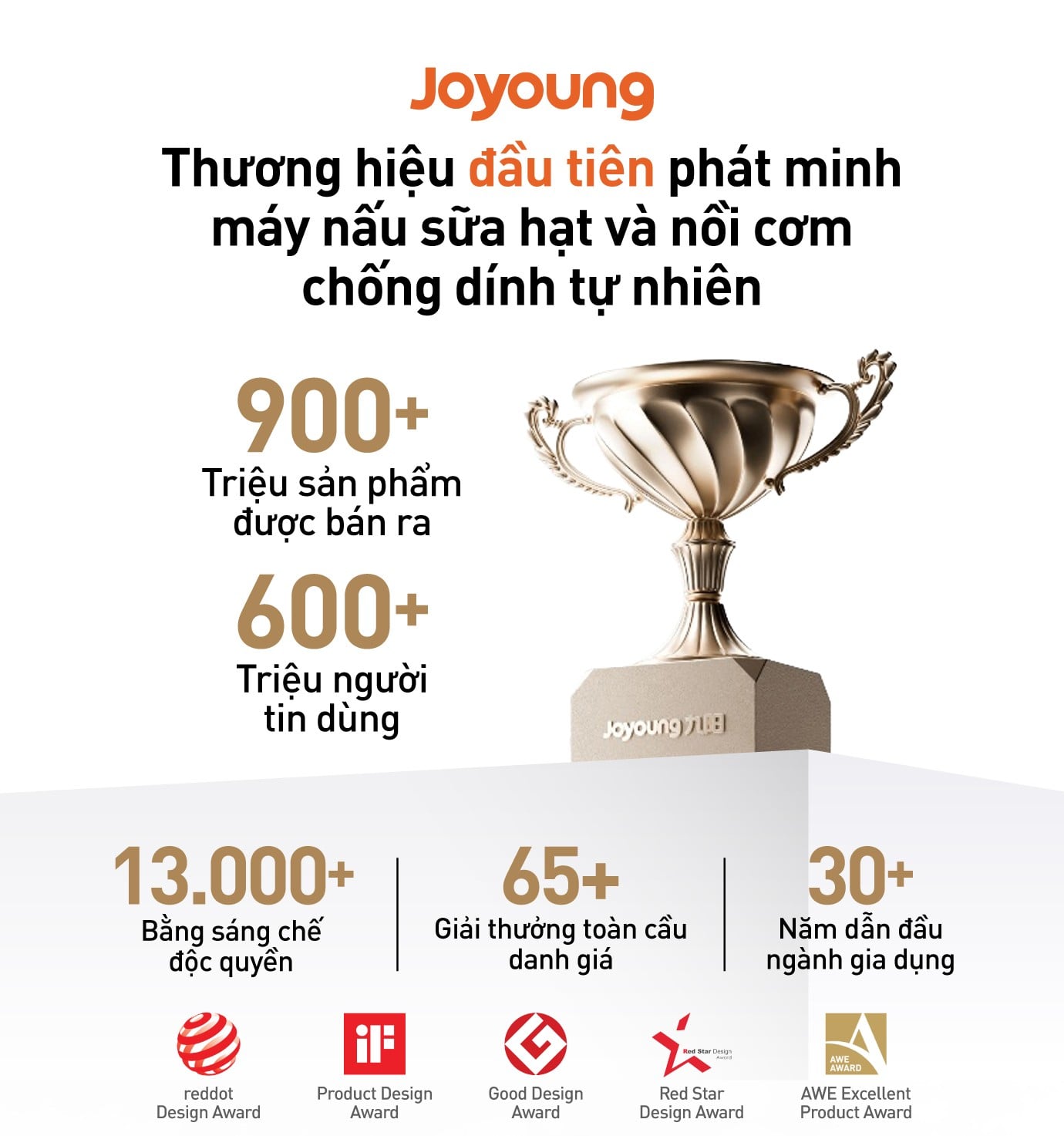 Joyoung thương hiệu đầu tiên phát minh ra máy nấu sữa hạt và nồi cơm chống dính tự nhiên, trải qua hơn 30 năm hình thành và phát triển, Joyoung không ngừng đổi mới công nghệ để mang đến những sản phẩm nhà bếp chất lượng vượt trội, thiết kế tinh tế và thân thiện với người dùng.