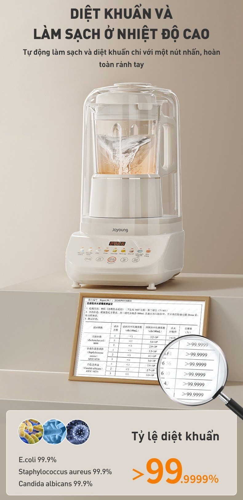 Máy nấu sữa hạt chống ồn Joyoung JHSB-602 với chức năng Làm sạch ở nhiệt độ cao và Tiệt trùng giúp loại bỏ đến 99,999% các loại vi khuẩn như: E.Coli, Staphylococcus aureus, Candida albicans,...Nhờ đó, người dùng hoàn toàn yên tâm về độ an toàn vệ sinh, đồng thời tiết kiệm đáng kể thời gian và công sức trong khâu vệ sinh sau mỗi lần sử dụng.