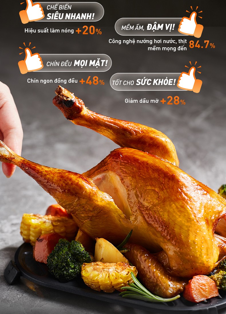 Với các món chiên, nướng, người dùng chỉ cần rất ít hoặc thậm chí không cần dầu ăn, nhưng vẫn đảm bảo món ăn chín vàng, giữ được hương vị tự nhiên và độ giòn cần thiết. Điều này đặc biệt phù hợp với gia đình có người lớn tuổi, trẻ nhỏ, hoặc những người đang theo đuổi chế độ ăn uống lành mạnh, kiểm soát cân nặng và sức khỏe tim mạch.