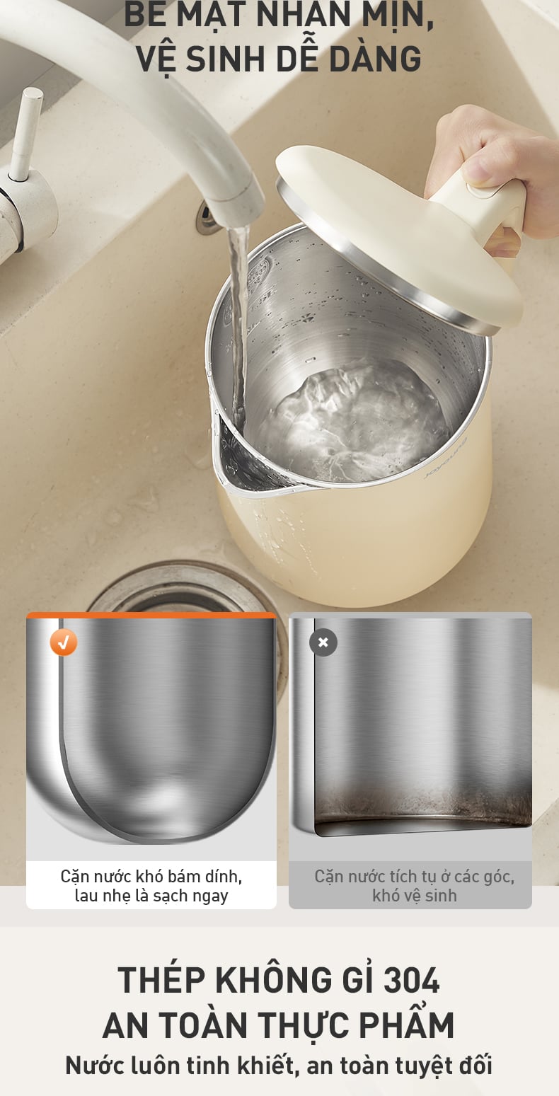 Bên cạnh khả năng gia nhiệt vượt trội, đáy chữ U còn được tối ưu để hạn chế góc chết trong lòng ấm, giúp ngăn cặn vôi bám tích tụ vào các khe hay góc khuất so với đáy phẳng, nhờ vậy lòng ấm luôn sạch sẽ, đảm bảo chất lượng nước sau mỗi lần đun. Đặc biệt, lòng ấm được chế tạo từ thép không gỉ 304 cao cấp, không chỉ an toàn cho sức khỏe, chống ăn mòn hiệu quả mà còn duy trì độ sáng bóng lâu dài. Người dùng không cần tốn nhiều công sức cọ rửa, chỉ cần xả nước hoặc lau nhẹ là bề mặt lòng ấm đã sạch sẽ như mới, mang đến trải nghiệm sử dụng bền bỉ và tiện lợi hơn.