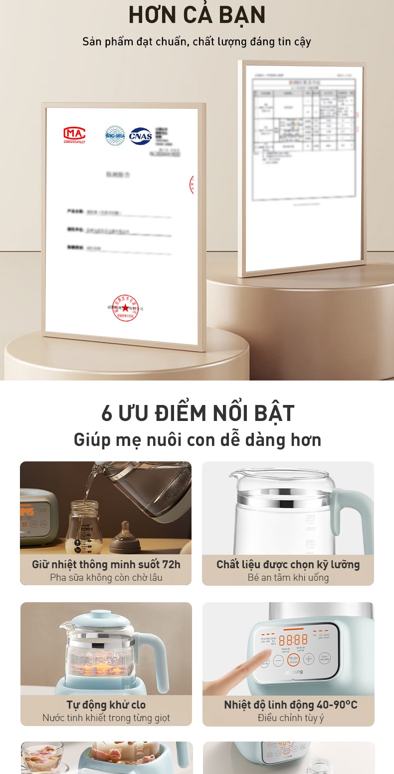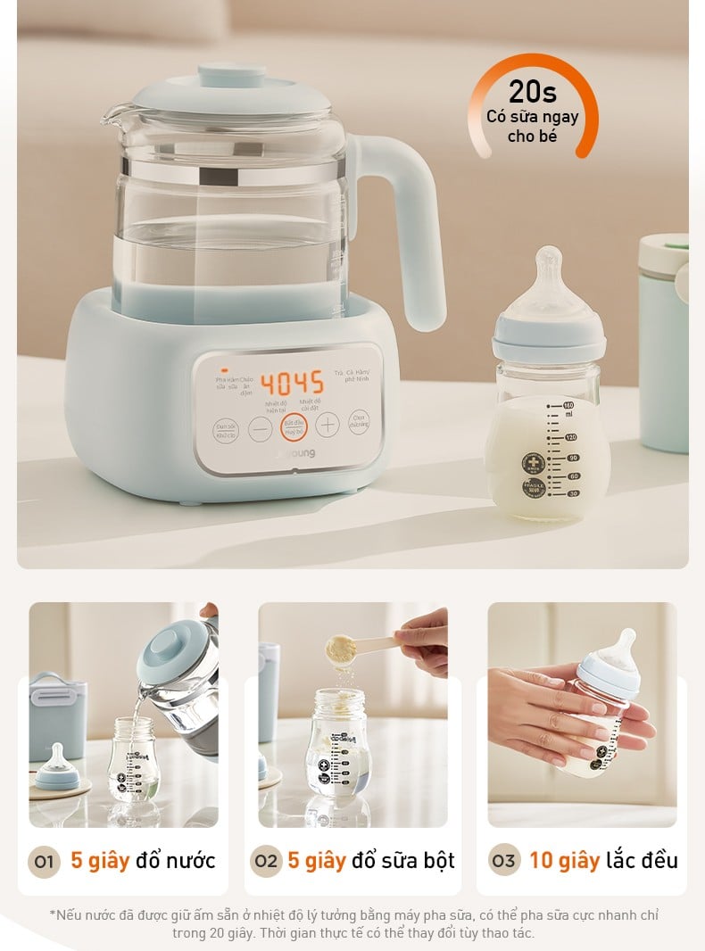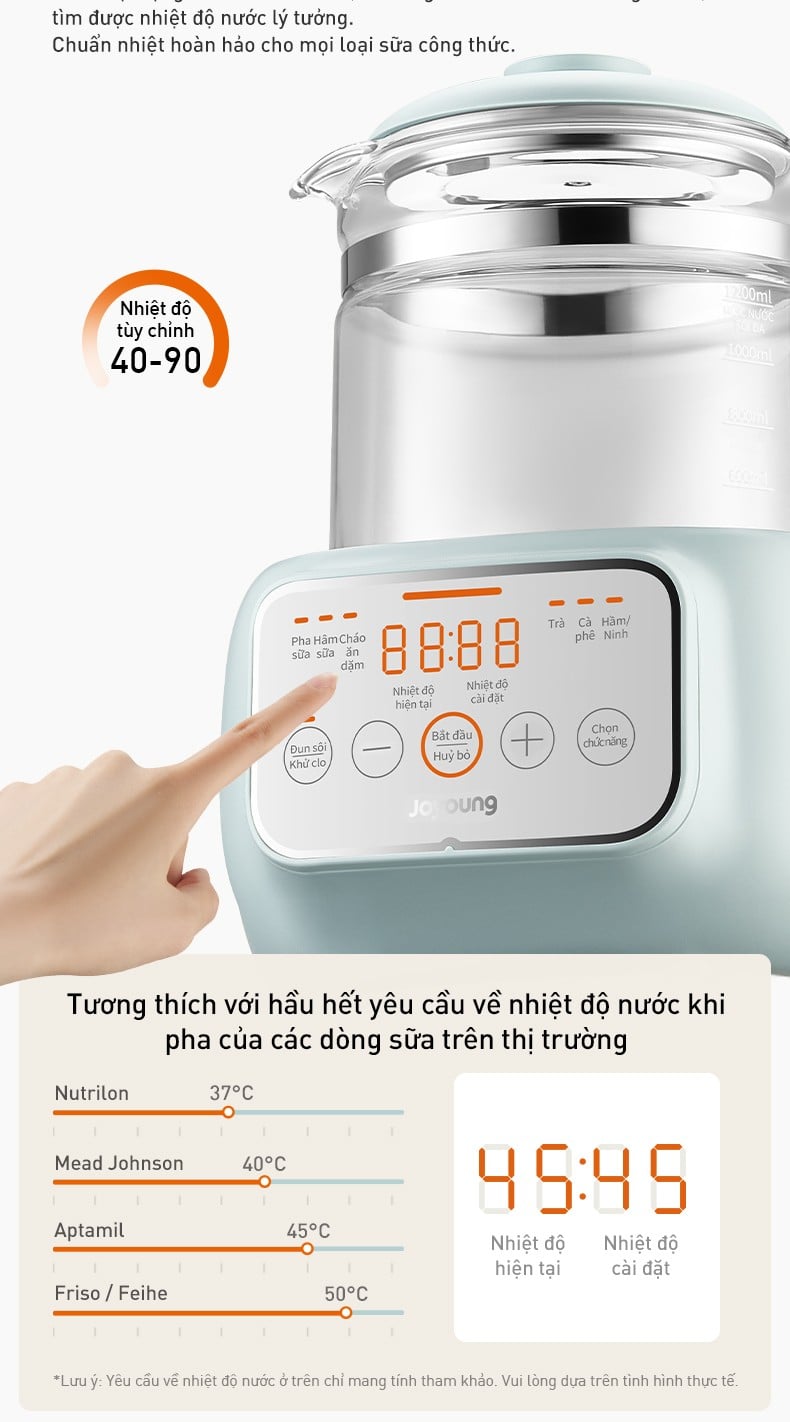 - Tiện lợi tối đa: Dải nhiệt rộng cho phép bạn sử dụng bình đun nước pha sữa để pha nhiều loại đồ uống khác nhau cho cả gia đình, từ trà, cà phê đến nấu cháo.