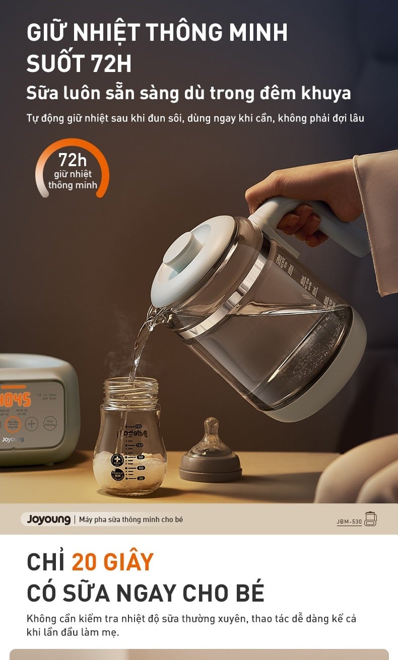 Với tính năng giữ nhiệt thông minh suốt 72 giờ, máy đun nước hâm sữa thông minh cho bé JBM-530 trở thành trợ thủ đắc lực của ba mẹ trong hành trình chăm con. Máy hâm sữa JBM-530 không chỉ hữu ích cho những cữ bú đêm của con, mà việc giữ ấm nước còn đáp ứng linh hoạt nhiều nhu cầu sinh hoạt khác như pha trà, cà phê,... cho cả gia đình.