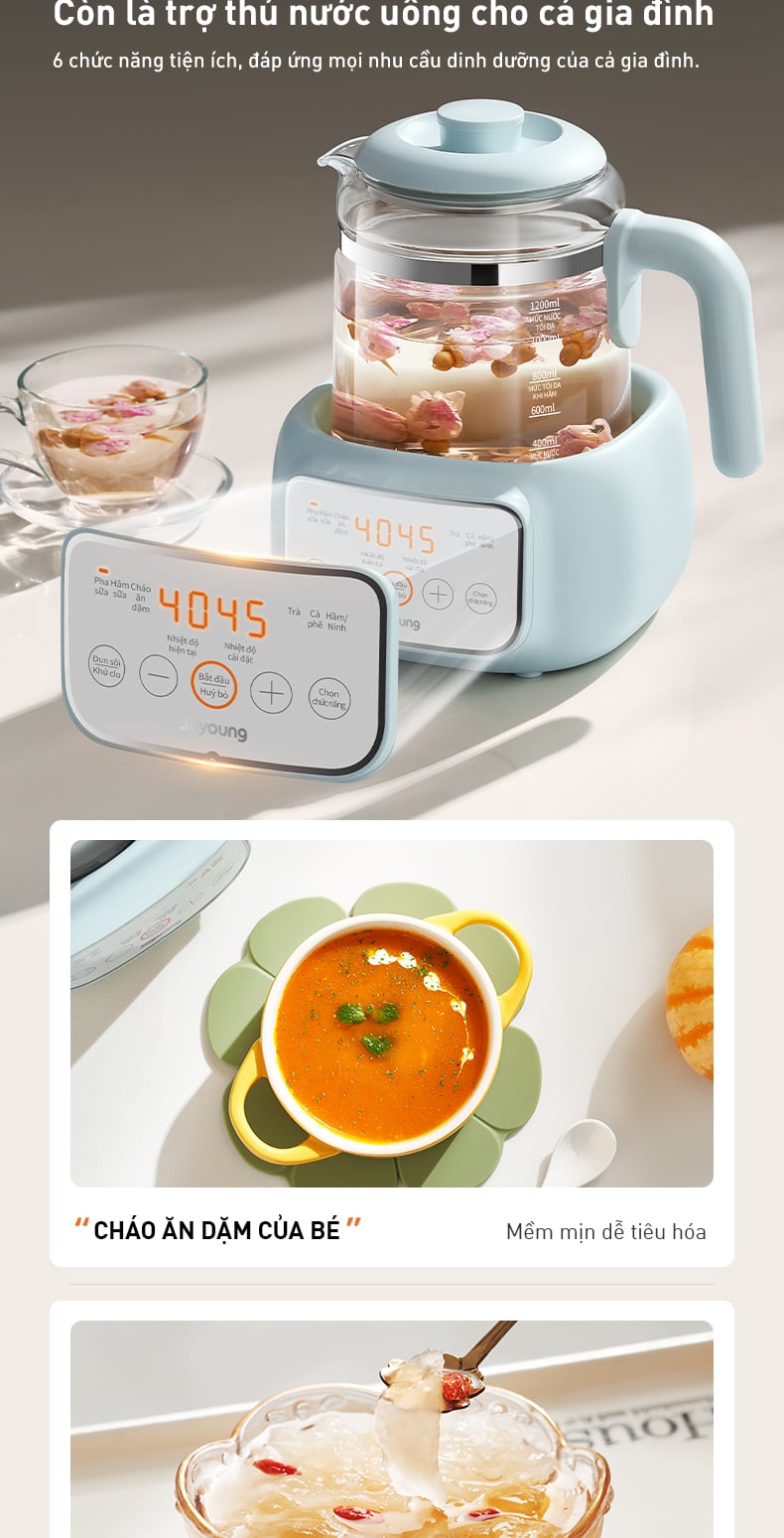 Không chỉ dừng lại ở chức năng đun nước pha sữa cho bé, JBM-530 dung tích 1.2L còn được tích hợp đến 6 chế độ tiện ích, đáp ứng linh hoạt nhiều nhu cầu sử dụng của cả gia đình. Ba mẹ có thể dễ dàng chọn các chế độ phù hợp, từ đun nước pha sữa, hâm sữa cho bé đến nấu cháo ăn dặm hay hầm, ninh các món ăn giàu dinh dưỡng, mang lại sự tiện lợi tối đa trong hành trình chăm sóc bé yêu.