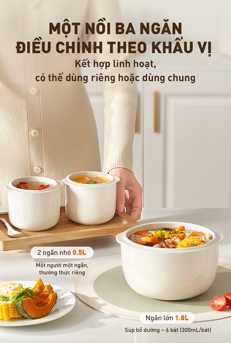 Bằng 1 lần chạm, bạn có thể nấu được các món súp phức tạp cho đến các món tráng miệng mất nhiều thời gian như: Súp gà/vịt, Súp bò/cừu, Súp xương, Súp ngũ cốc, Cháo dinh dưỡng, Yến sào chưng, Chè đậu,... giúp quá trình nấu ăn trở nên đơn giản hơn, bữa ăn gia đình ngày càng phong phú chỉ với 1 nồi nấu chậm.