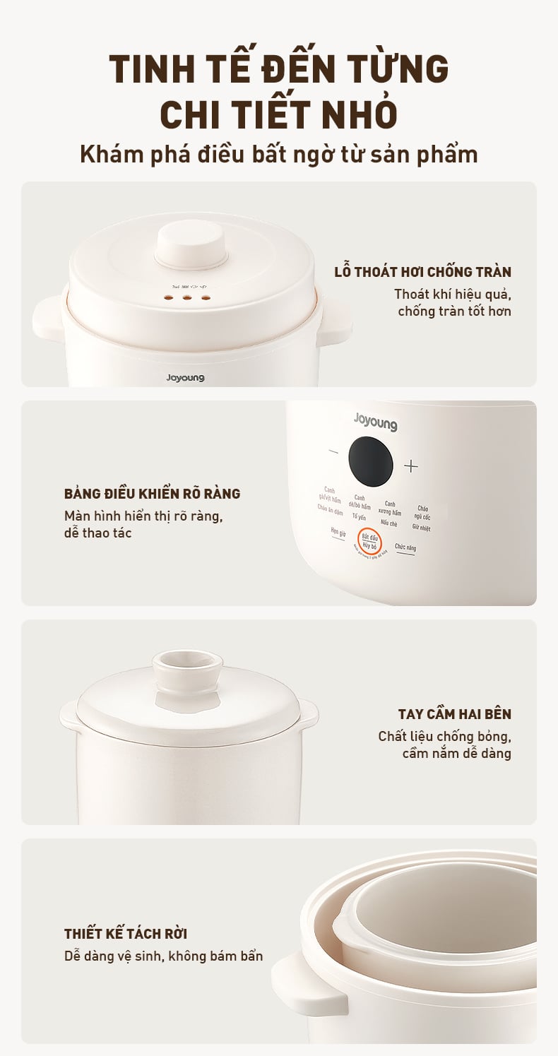 Thấu hiểu những khó khăn của người dùng trong quá trình nấu ăn, Joyoung đã cải tiến thiết kế nồi nấu chậm JSC-187 như trang bị lỗ thoát hơi chống tràn, bảng điều khiển cảm ứng, tay cầm chống bỏng, thiết kế tách rời dễ vệ sinh,... mang lại sự tiện lợi tối đa cũng như hạn chế tình trạng bị thương khi nấu.