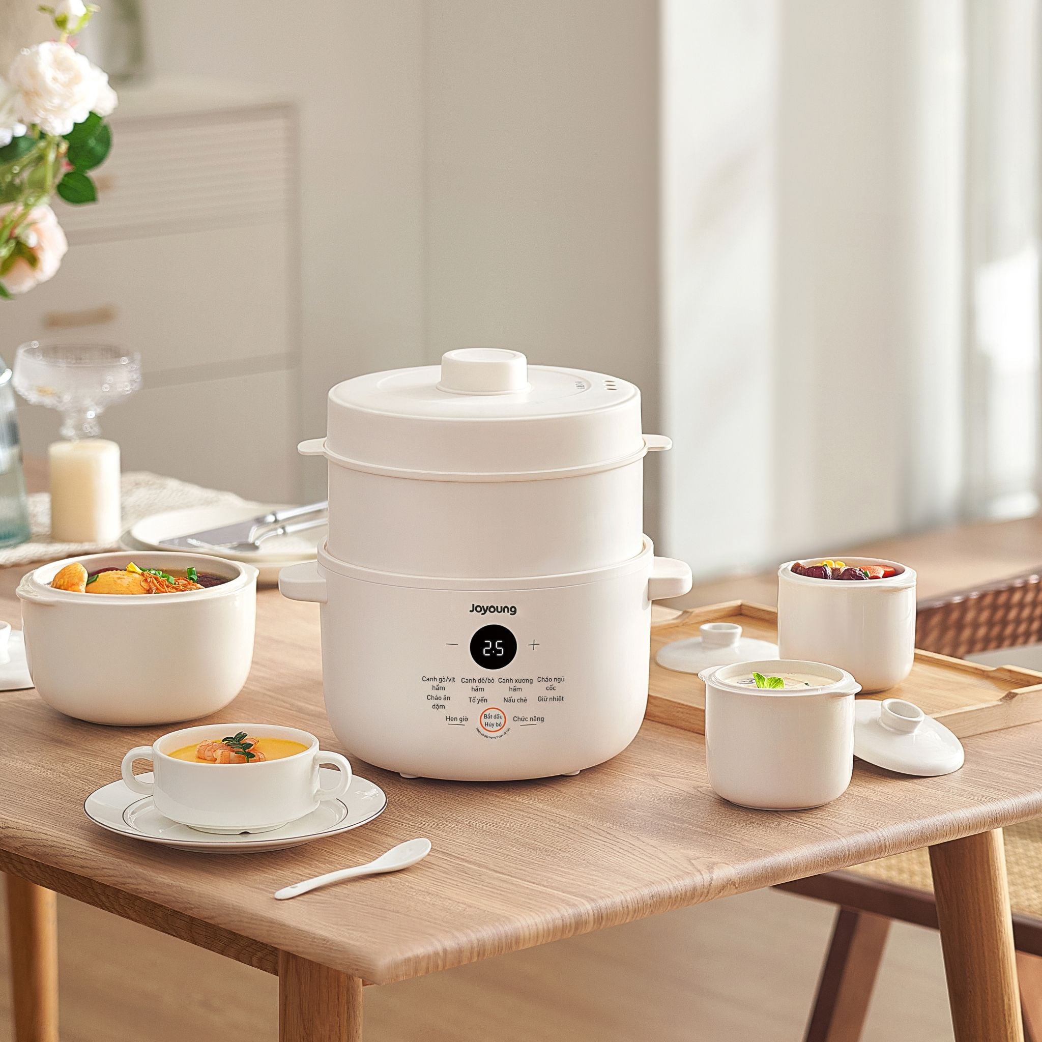 8 chế độ nấu: Súp gà/vịt, Súp bò/cừu, Súp xương, Súp ngũ cốc, Cháo cho bé, Tổ yến, Nấu chè